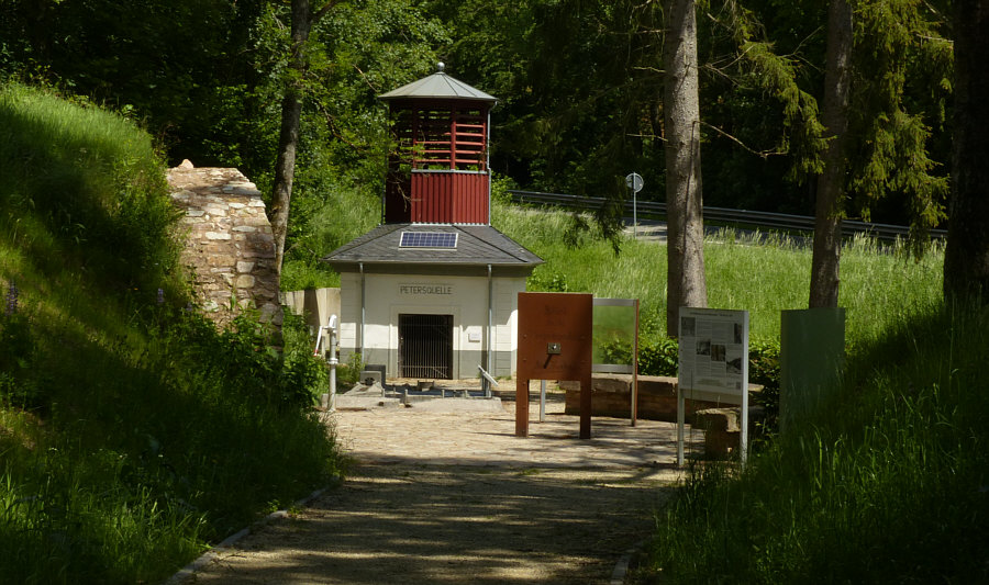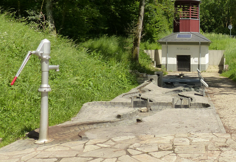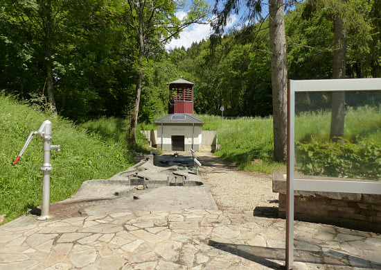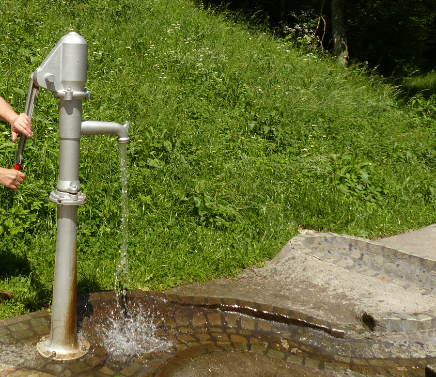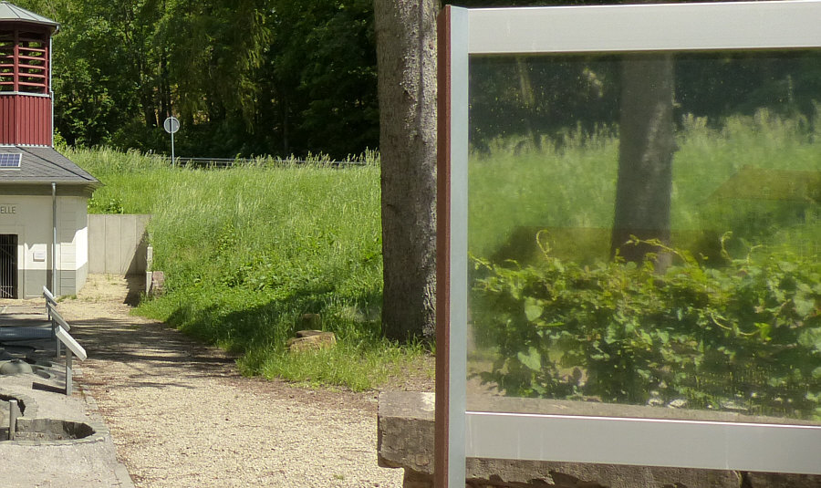 ... und sehen links eine Wasserpumpe und rechts einen Schaukasten mit