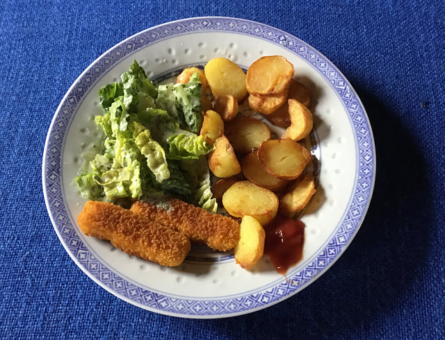 Bratkartoffeln, Lachs-Fischstäbchen und Salat.