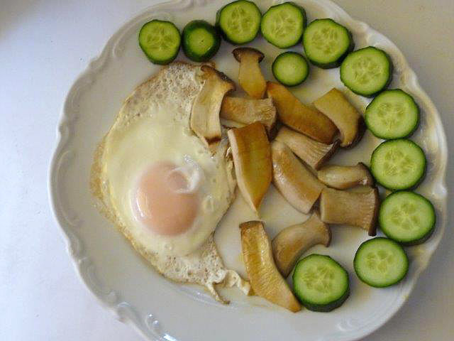 Gebratene Kräuterseitlinge mit Spiegelei und Snackgurken vom eigenen