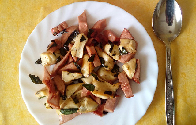 Dazu eine kleine Scheibe Leberkäse und Pfannenkäse zusammen kurz