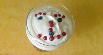 Als Nachtisch Quarkspeise mit den ersten Heidelbeeren und Johannisbeeren