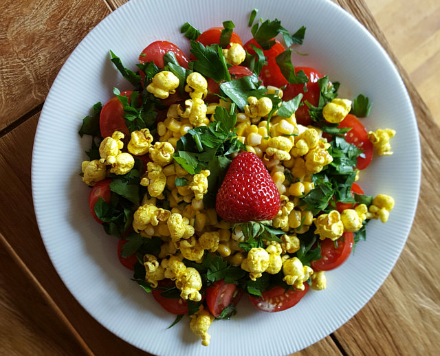 Tomaten-Mais-Salat mit Curry Popcorn.