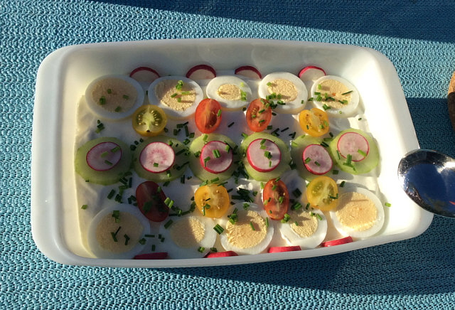 belegt mit harten Eiern, gefüllt mit Topfen-Schnittlauch-Aufstrich,