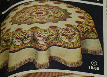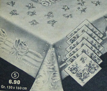 Die reinweiße Damast-Tischdecke mit Blumenmotiven.