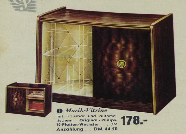 Hausbar und Musikvitrine mit Plattenspieler und Plattenständer.