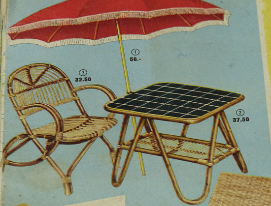 Umgerechneter Preis heute: Sessel 225 Euro, Tisch 260 Euro, Schirm 390