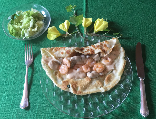 Eierpfannkuchen mit Champignons in Sahnesoße und gebratenen Shrimps.