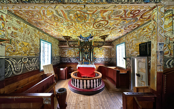 Heute gucken wir, wo wir sind, und dann ziehen wir weiter ... hier sind wir ... ![]() ![]() ... in dieser ganz bemerkenswerten Kirche ... die manchen sehr gut gefällt, für andere nicht zum Aufenthalt geeignet ist. Ganz erstaunlich wandelt sich das Bild, wenn wir die Kirche von außen betrachten: ![]() Eine ganz schlichte Kirche aus Holz. Wir waren in der Stordal Gamle Kirke ... in Stordal, einem 1000-Einwohner-Ort in Norwegen an der Atlantikküste. Ganz in der Nähe dieser Kirche ... im Bild hinten rechts zu sehen, gibt es dieses Gebäude: ![]() Das nennt sich Løsetstova ... ein historisches Langhaus ... ![]() ... das innen so aussieht: ![]() Stordal liegt am Storfjord ... ![]() ... in einer traumhaften Umgebung: ![]() Eigentlich wollte ich ja jetzt weiter gehen zu einer anderen Kirche in der Nähe ... ... aber angesichts dieses Bildes ... nee, das geht nicht ... ich kann nicht diese Weite verlassen, um mich in einem engen Raum mit Kreuz wiederzufinden ... heute bleiben wir hier draußen ... ... atmen tief die klare norwegische Luft ein und und machen am Abend ... ![]() ... einen meditativen Spaziergang am Ufer des Fjordes. |