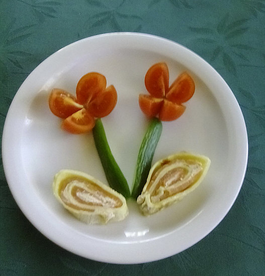 Eine Snackgurke vierteln und die Blüten sind Kirschtomaten.