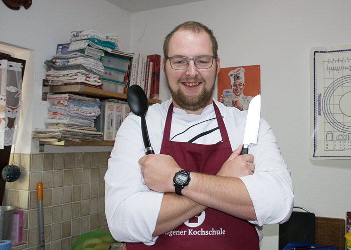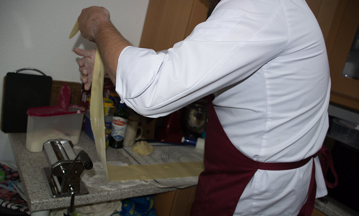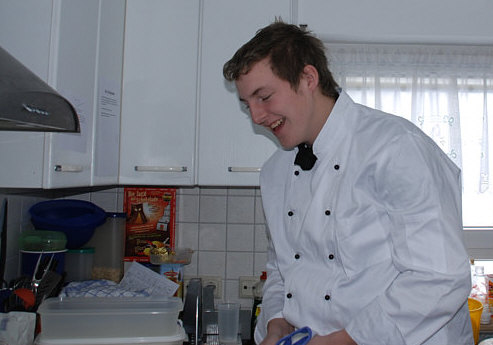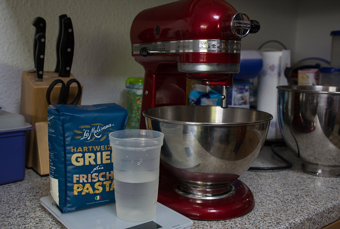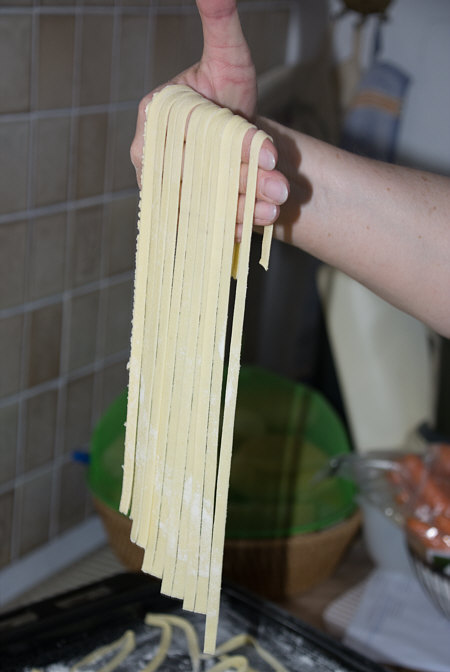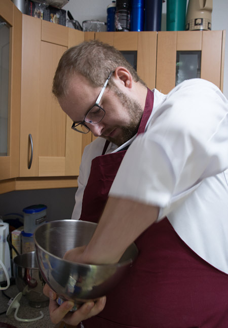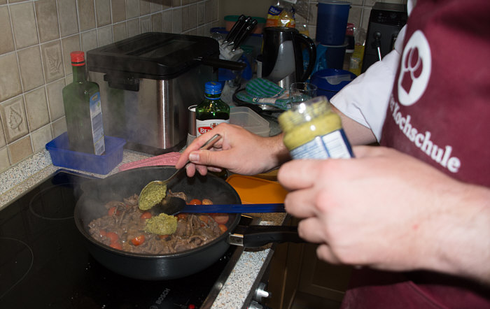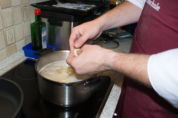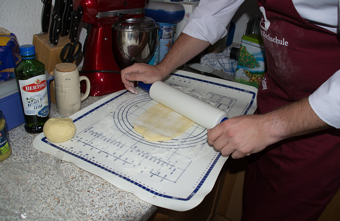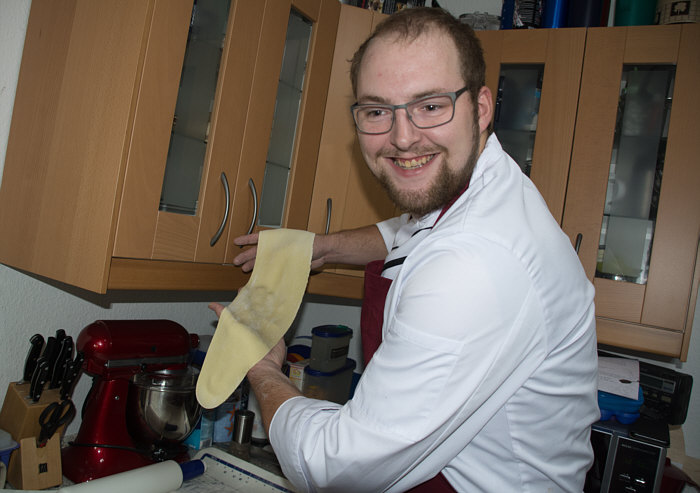 Vor 8 Jahren ... ![]() ... war er Plätzchenbäcker. Vor 7 Jahren ... ![]() ... hat er als "Sternekoch" ein Weihnachtsmenü gezaubert. Vor 2 Jahren ... ![]() ... war er quasi das Christkind und es gab Geschenke ... aus der Küche. Und heute ?? Ja, heute ist er wieder da ... Alexander, der Sohn von Birgit W., der ja zwischenzeitlich sogar eine kurze Zeit das Kochen als Beruf erlernen wollte, aber dann hat er sich entschieden, dass das doch ein Hobby bleiben wird. Was er diesmal getan hat, haben nur wenige von uns schon gemacht. Auch ich habs noch nie getan, da hat er mir etwas voraus. Begonnen hat ja alles mit einem Geschenk für Alexander, ein Abend in der Siegener Kochschule. Im Juli war das ... und seitdem erzählt er seinen Eltern davon, die damals in Urlaub waren und nicht hautnah beim Geschehen dabei sein konnten. Doch nun kam der Seelenfarbenaufruf ... und dort stand das Wort Pasta drin. Und nun gings los ... denn in der Kochschule gings um das Thema Pasta und nun kommt der große Auftritt von Alexander als "Il Cuciniere": Nein, das hat nix mit Niere zu tun ... heute gibt es Pasta. Aber nicht irgendeine Pasta, sondern ... ... selbstgemachte Tagliatelle. Wow ... selbst gemacht ... und wir dürfen zuschauen :)). Die Zutaten ... ![]() ... Hartweizengries, Wasser, Prise Salz und eine futuristische Küchenmaschine. Und der Küchenchef natürlich :)). ![]() Ja, den Blick schon auf die Küchenmaschine gerichtet ... und jetzt gehts rund ... ![]() ... die Küchenmaschine mischt und knetet. Nun wird Alexander zur Küchenmaschine ... ![]() ... und beginnt auch zu kneten, bis ein Teigfladen entstanden ist: ![]() Der Teig muss so lange geknetet werden, bis er fest und glatt ist und nicht mehr an den Fingern klebt. Dann wird die Teigkugel ... ![]() ... in Folie verpackt und kommt 30 Minuten in den Kühlschrank. Das gibt uns Gelegenheit, die übrigen Zutaten für die Pfanne vorzubereiten: ![]() 300 g Rindfleisch (hier sind es 2 schöne Rouladen aus der Oberschale, aber es geht auch mit Filet oder Rumpsteak) Ca. 20 Cherrytomaten 1 Bund Rucola (der war nicht schnell genug und ist deswegen nicht auf dem Bild) 2 El Basilikumpesto Upps ... der Rucola wurde ja von Birgit nach Hause geschickt ... denn Birgit sagt "wir hatten Basilikum/Rucolapesto und haben auf frischen Rucola verzichtet, da uns der häufig zu bitter ist". Aha ... das ist bitter für den frischen Rucola ;)). Dazu später mehr, ich wollts nur mal zeigen. (Schön, dass wir mal drüber gesprochen haben ;)) ) Kleines Päuschen ... und dann gehts mit dem Teig weiter. ![]() Ausrollen ... dünn ausrollen. Nicht alles, schön portionsweise. Nun kommt die Nudelmaschine ins Spiel ... ![]() ... das wird hart für den Teig, aber da muss er durch. Ihr glaubt gar nicht, was dieser dünne Nudelteig bei Alexander an Gefühlen auslöst ... ![]() ... in seinen Augen steht eindeutig der Satz "wie geil ist das denn" geschrieben ;)). Nun wird der geile Teig zu Tagliatelle geschnitten. Diese muss dann ... ![]() ... auf einem Küchentuch oder einem bemehlten Blech trocknen. Jetzt gehts ans Fleisch, das wird in Streifen geschnitten und auch die Tomaten verlieren ihre Form und werden zu Hälften geschnitten. ![]() Das Fleisch in der Pfanne scharf anbraten ... ![]() ... die Tomaten dazu geben ... ![]() ... kurz mitdünsten, das Pesto dazu ... ![]() ... und evtl. noch mit Salz abschmecken. ![]() Irgendwo sollte inzwischen auf dem Herd irgendwie ein Topf mit kochendem Wasser stehen ... ... der auf die immer noch auf dem Mehl liegenden Tagliatelle wartet. ![]() Hey, Birgit ... was machst du denn da ... bitte nicht ... nein, nicht das Fenster öffnen ... ... nicht bei diesem Herbsturm, der gerade zum Orkan wird. Zu spät ... denn schon ... ![]() ... liegen die Nudeln waagerecht im Wind und drohen, fortzufliegen ... auwei !! Wie ? Was meinst Du damit, dass ich das Bild drehen soll ? Warum ? Aaah ... damit das Wetter besser wird ... das ist ein Argument. ![]() So nun liegen die Nudeln richtig ... ... und nun ab damit ins kochende Salzwasser: ![]() Die müssen nicht lange kochen, je nach Dicke zwischen 2 und 4 Minuten. Am besten öfter probieren, damit sie nicht zu lange drin baden. Jetzt ab damit in die Pfanne ... ![]() ... kurz durchschwenken ... und fertig ist ... ![]() ... die oberleckere Pastapfanne mit selbst gemachter Tagliatelle. Dafür gibts den zweiten Stern für Alexander :)). |