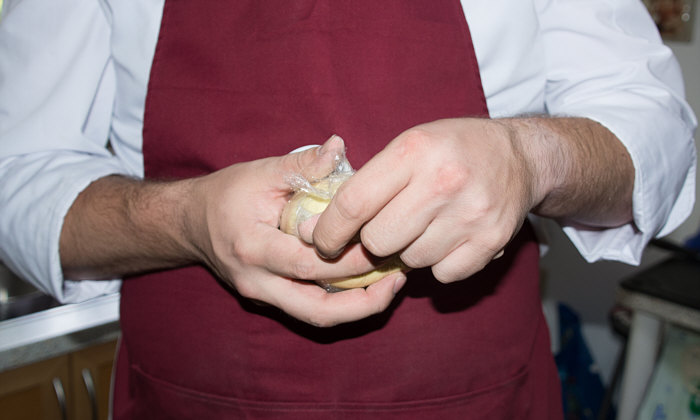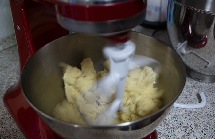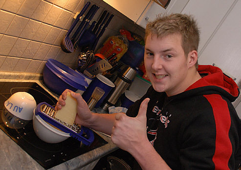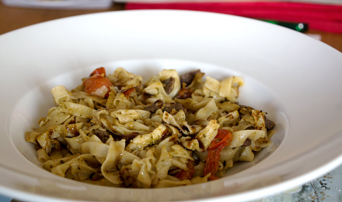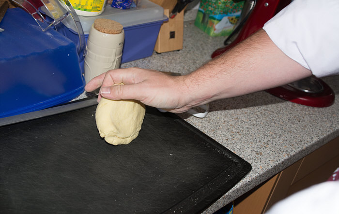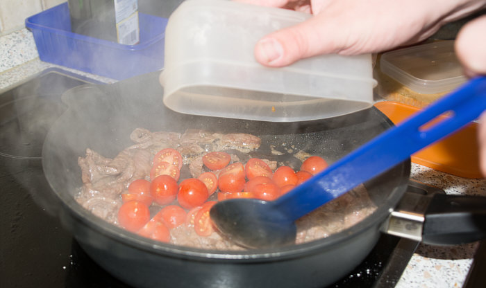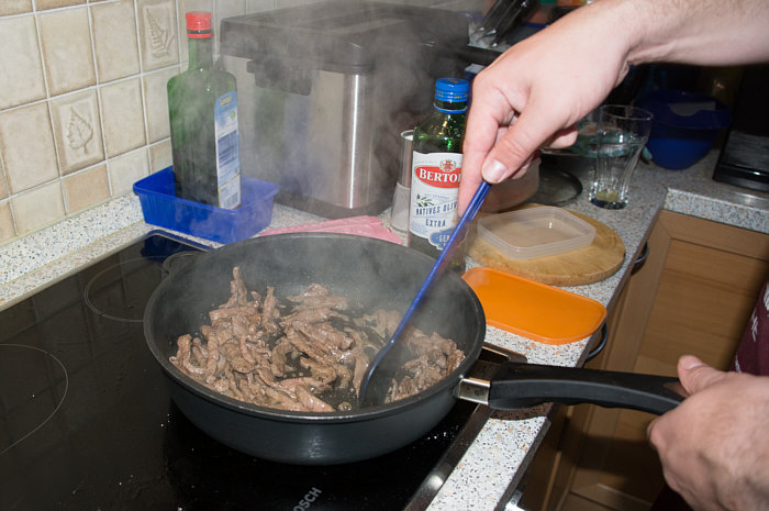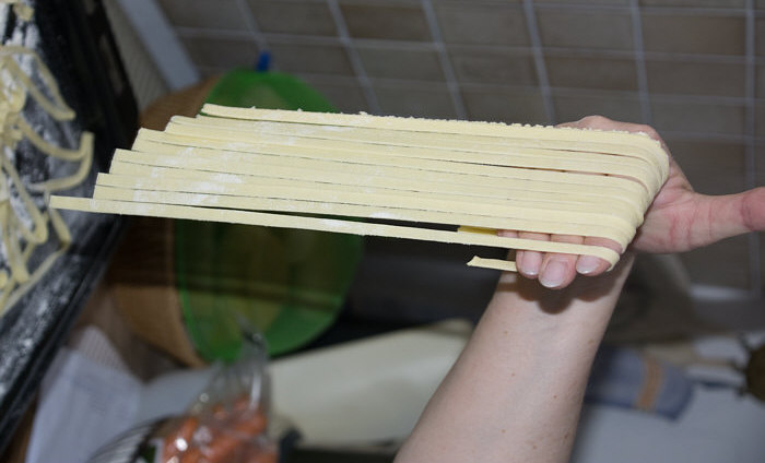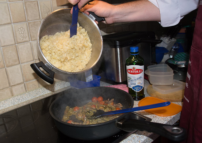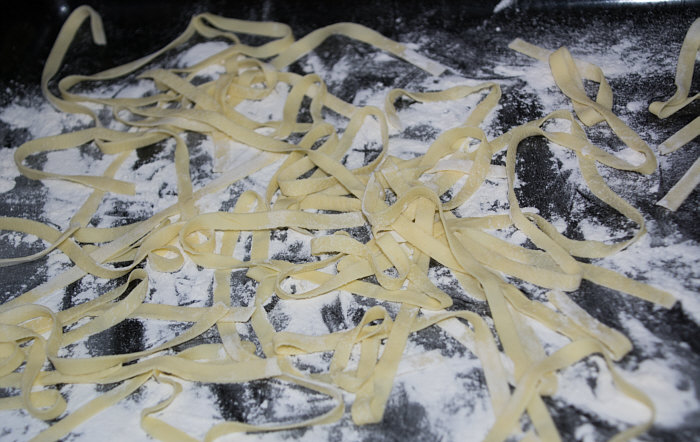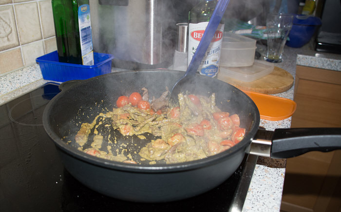 Vor 8 Jahren ... ![]() ... war er Plätzchenbäcker. Vor 7 Jahren ... ![]() ... hat er als "Sternekoch" ein Weihnachtsmenü gezaubert. Vor 2 Jahren ... ![]() ... war er quasi das Christkind und es gab Geschenke ... aus der Küche. Und heute ?? Ja, heute ist er wieder da ... Alexander, der Sohn von Birgit W., der ja zwischenzeitlich sogar eine kurze Zeit das Kochen als Beruf erlernen wollte, aber dann hat er sich entschieden, dass das doch ein Hobby bleiben wird. Was er diesmal getan hat, haben nur wenige von uns schon gemacht. Auch ich habs noch nie getan, da hat er mir etwas voraus. Begonnen hat ja alles mit einem Geschenk für Alexander, ein Abend in der Siegener Kochschule. Im Juli war das ... und seitdem erzählt er seinen Eltern davon, die damals in Urlaub waren und nicht hautnah beim Geschehen dabei sein konnten. Doch nun kam der Seelenfarbenaufruf ... und dort stand das Wort Pasta drin. Und nun gings los ... denn in der Kochschule gings um das Thema Pasta und nun kommt der große Auftritt von Alexander als "Il Cuciniere": Nein, das hat nix mit Niere zu tun ... heute gibt es Pasta. Aber nicht irgendeine Pasta, sondern ... ... selbstgemachte Tagliatelle. Wow ... selbst gemacht ... und wir dürfen zuschauen :)). Die Zutaten ... ![]() ... Hartweizengries, Wasser, Prise Salz und eine futuristische Küchenmaschine. Und der Küchenchef natürlich :)). ![]() Ja, den Blick schon auf die Küchenmaschine gerichtet ... und jetzt gehts rund ... ![]() ... die Küchenmaschine mischt und knetet. Nun wird Alexander zur Küchenmaschine ... ![]() ... und beginnt auch zu kneten, bis ein Teigfladen entstanden ist: ![]() Der Teig muss so lange geknetet werden, bis er fest und glatt ist und nicht mehr an den Fingern klebt. Dann wird die Teigkugel ... ![]() ... in Folie verpackt und kommt 30 Minuten in den Kühlschrank. Das gibt uns Gelegenheit, die übrigen Zutaten für die Pfanne vorzubereiten: ![]() 300 g Rindfleisch (hier sind es 2 schöne Rouladen aus der Oberschale, aber es geht auch mit Filet oder Rumpsteak) Ca. 20 Cherrytomaten 1 Bund Rucola (der war nicht schnell genug und ist deswegen nicht auf dem Bild) 2 El Basilikumpesto Upps ... der Rucola wurde ja von Birgit nach Hause geschickt ... denn Birgit sagt "wir hatten Basilikum/Rucolapesto und haben auf frischen Rucola verzichtet, da uns der häufig zu bitter ist". Aha ... das ist bitter für den frischen Rucola ;)). Dazu später mehr, ich wollts nur mal zeigen. (Schön, dass wir mal drüber gesprochen haben ;)) ) Kleines Päuschen ... und dann gehts mit dem Teig weiter. ![]() Ausrollen ... dünn ausrollen. Nicht alles, schön portionsweise. Nun kommt die Nudelmaschine ins Spiel ... ![]() ... das wird hart für den Teig, aber da muss er durch. Ihr glaubt gar nicht, was dieser dünne Nudelteig bei Alexander an Gefühlen auslöst ... ![]() ... in seinen Augen steht eindeutig der Satz "wie geil ist das denn" geschrieben ;)). Nun wird der geile Teig zu Tagliatelle geschnitten. Diese muss dann ... ![]() ... auf einem Küchentuch oder einem bemehlten Blech trocknen. Jetzt gehts ans Fleisch, das wird in Streifen geschnitten und auch die Tomaten verlieren ihre Form und werden zu Hälften geschnitten. ![]() Das Fleisch in der Pfanne scharf anbraten ... ![]() ... die Tomaten dazu geben ... ![]() ... kurz mitdünsten, das Pesto dazu ... ![]() ... und evtl. noch mit Salz abschmecken. ![]() Irgendwo sollte inzwischen auf dem Herd irgendwie ein Topf mit kochendem Wasser stehen ... ... der auf die immer noch auf dem Mehl liegenden Tagliatelle wartet. ![]() Hey, Birgit ... was machst du denn da ... bitte nicht ... nein, nicht das Fenster öffnen ... ... nicht bei diesem Herbsturm, der gerade zum Orkan wird. Zu spät ... denn schon ... ![]() ... liegen die Nudeln waagerecht im Wind und drohen, fortzufliegen ... auwei !! Wie ? Was meinst Du damit, dass ich das Bild drehen soll ? Warum ? Aaah ... damit das Wetter besser wird ... das ist ein Argument. ![]() So nun liegen die Nudeln richtig ... ... und nun ab damit ins kochende Salzwasser: ![]() Die müssen nicht lange kochen, je nach Dicke zwischen 2 und 4 Minuten. Am besten öfter probieren, damit sie nicht zu lange drin baden. Jetzt ab damit in die Pfanne ... ![]() ... kurz durchschwenken ... und fertig ist ... ![]() ... die oberleckere Pastapfanne mit selbst gemachter Tagliatelle. Dafür gibts den zweiten Stern für Alexander :)). |