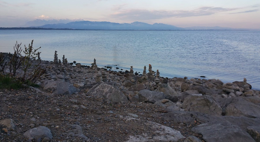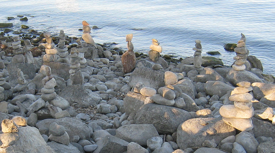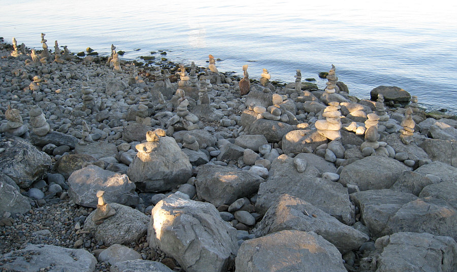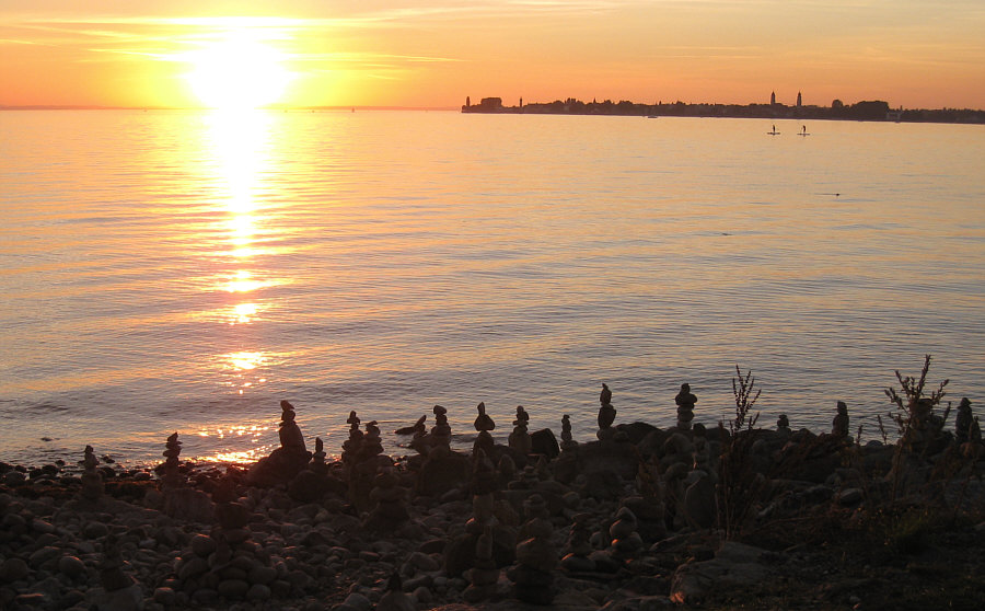 Viele Steine ... ![]() ... und viele liebevolle Hände, die diese Steine zu Steinmännchen schichten. Und stehen diese Männchen ... ![]() ... am Ufer und hören den Wellen zu. ![]() Man darf die Steinmännchen natürlich auch Steinmänner, Steinmandl oder Steinmanderl nennen. Wir stehen am Ufer eines großen Sees, der ein kleines Meer ist. Denn das ist der Bodensee ... will man einmal um ihn herumfahren, dann sind das 273 km, eine ganze Tagesreise. Der Bodensee ist fast so groß wie der Plattensee oder der Genfer See. Anni war dort und hat uns diese Bilder mitgebracht. Und auch den Sonnenuntergang ... ![]() ... mit den Steinmännchen und der Insel Lindau im Hintergrund. Hier bleiben wir eine Weile ... vielleicht nehmen wir uns einen Klappstuhl und warten gemeinsam, bis die Sonne im Wasser versinkt :)). |
