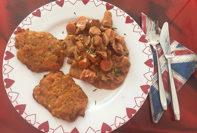 Süßkartoffelrösti mit Gemüse-Hähnchenpfanne