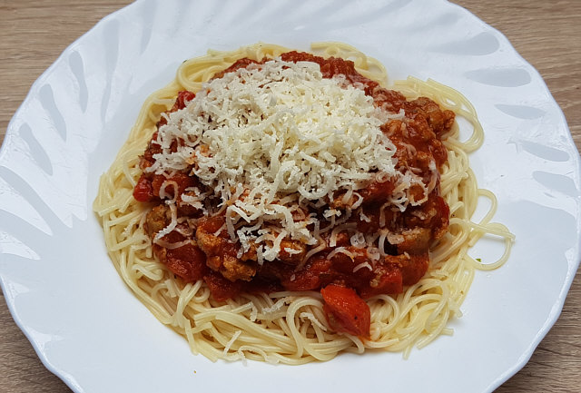 Spaghetti mit Tomaten-Geflügelhack-Soße und geriebenem italienischen