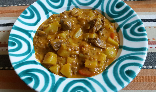 Dann gekochte Kartoffelwürfel und eine Dose Linsen zum Fleisch gegeben.