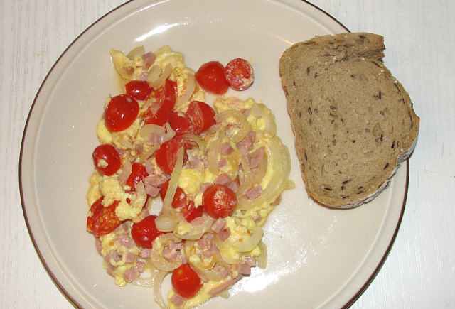 Fertig ist das Rührei mit Gemüse, noch ein Stück Brot dazu