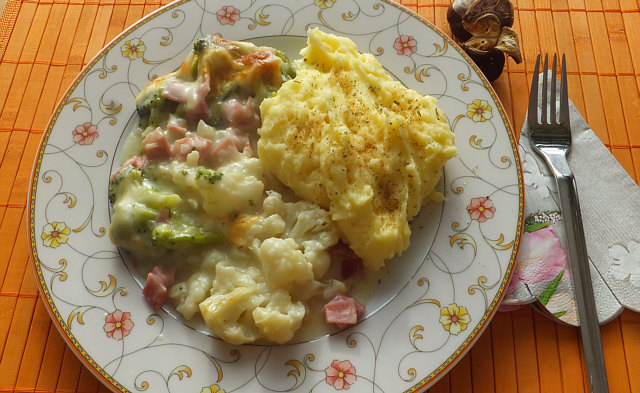 Gleiche Teile beider Gemüsesorten kurz kochen, mit gekochtem Schinken