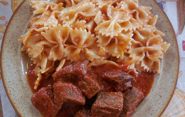 Kokkinisto – Rindfleisch in Tomatensauce gekocht, dazu Nudeln.