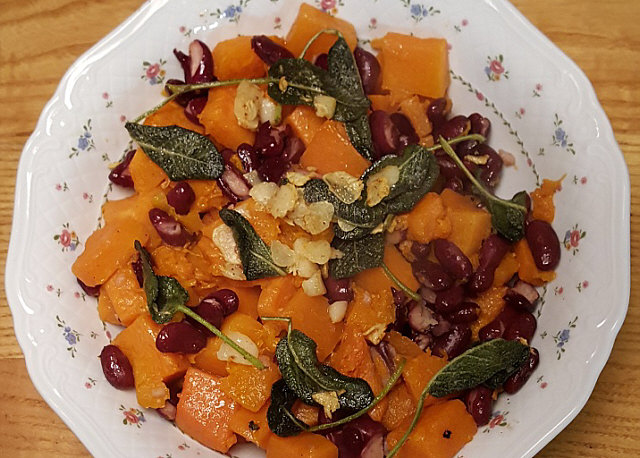 Die Kürbis-Bohnen Mischung auf Tellern anrichten und mit der
