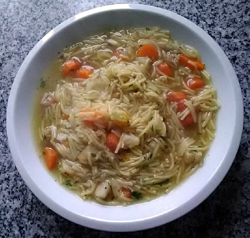 Hühnersuppe mit Nudeln mit Hühnerbrustfleisch, Suppengemüse und Nudeln