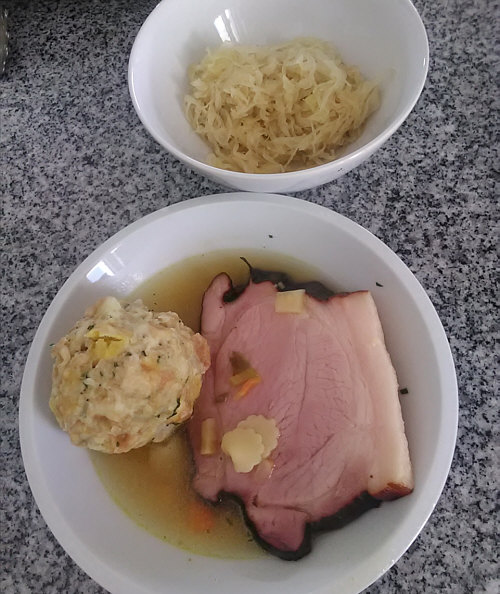 Geselchtes (Rauchfleisch) mit Gabelkraut und Semmelknödel