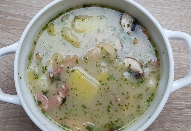 Kartoffelsuppe mit Champignons, Bohnen und Bacon.