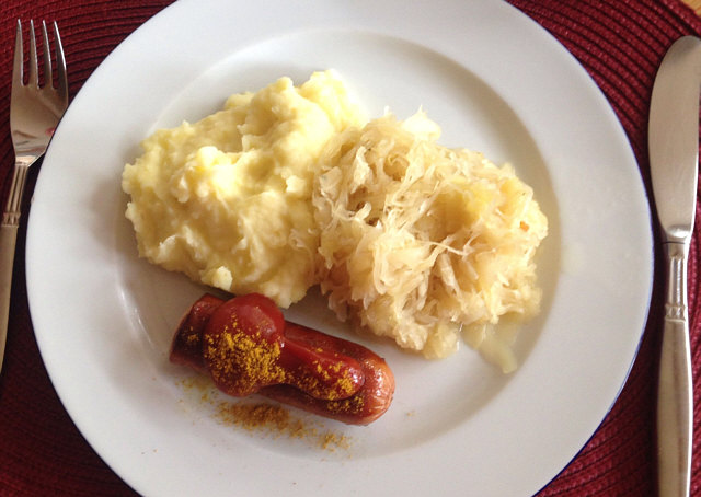 Am nächsten Tag hab ich Apfel-Sauerkraut mit Bratwurst und Püree