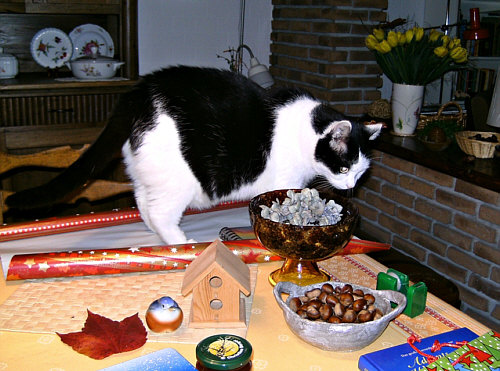 ein Geschenk zu Weihnachten? Leider habe ich kein Haustier mehr. Aber für meinen verstorbenen Kater Momo habe ich immer ein besonderes Leckerli gehabt und es war eine große Freude, mit ihm zusammen das Weihnachtsfest zu erleben. Er war bei allen Arbeiten dabei und hat mir auch beim Geschenke einpacken "geholfen". ![]() Jetzt werden dafür Spatzen, Grünfinken, Buchfinken, Meisen, Rotkehlchen, Eichhörnchen, Igel, kleine Türkentauben, Eichelhäher in unserem Garten versorgt und alle bekommen zu Weihnachten das, was sie besonders gerne mögen. |