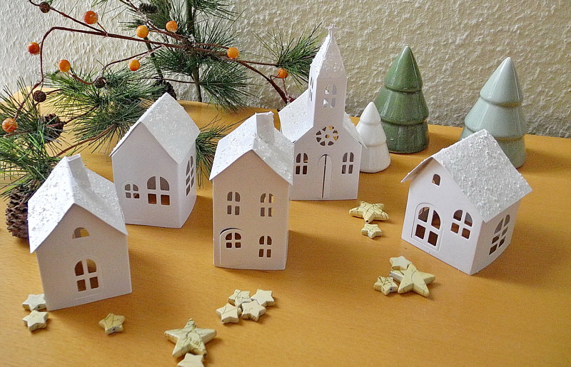 Zum Schluß bemalt man die Dächer mit Dekorschnee und bestäubt sie mit etwas