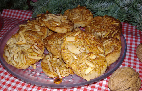 Ich hab sie der Einfachheit halber bestrichen und die Mandelblättchen einfach