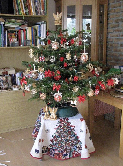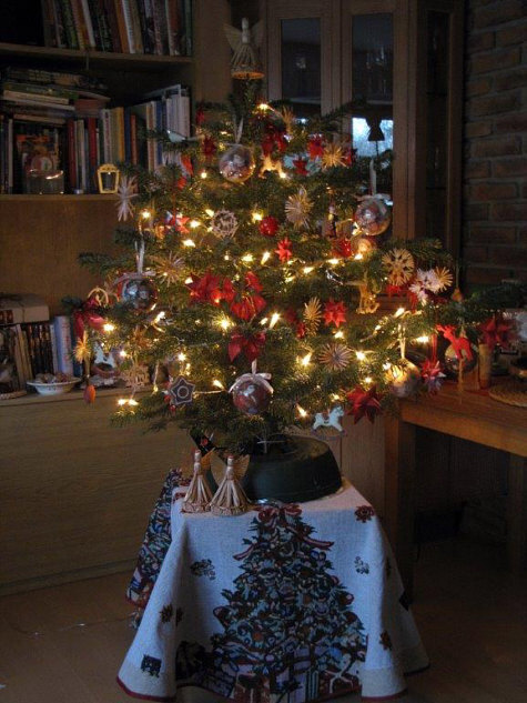 Geschmückt ist der Baum mit Strohsternen, selbst gebastelte rote Papiersternen,