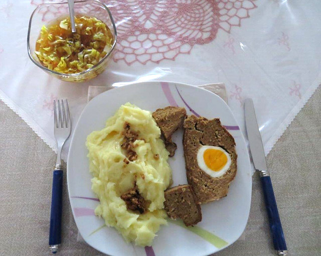 Es gab falscher Hase oder Hackbraten mit Ei fürs Auge, wird überall