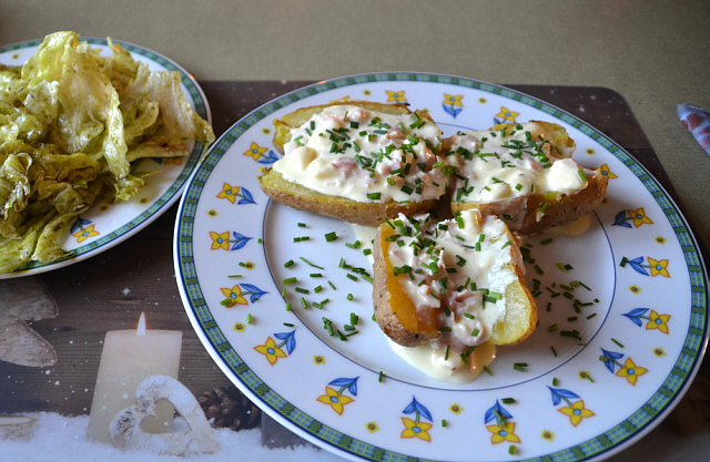 Kartoffeln am Teller in der Mitte anschneiden und auseinanderdrücken -