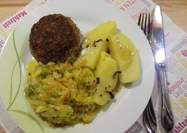 Frikadelle mit Lauch-Möhren-Meerrettich.