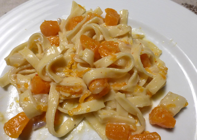 Frische Bio-Tagiatelle (aus dem Kühlregal) mit kleingeschnittenen