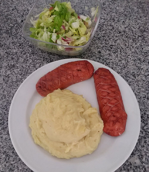gebratene Knackwurst mit Kartoffelpüree und Endiviensalat