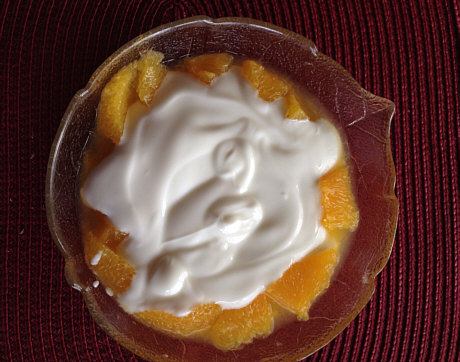 Als Nachtisch gab es filetierte Apfelsinenstücke mit Joghurt.
