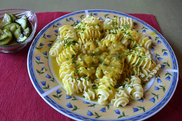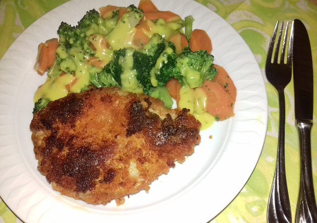 Cordon bleu und Möhren-Brokkoli-Gemüse mit leichter Curry-Rosmarin-Soße
