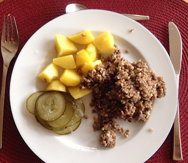 Knipp (Hackgrütze, Hackewack = Grützwurst), Kartoffeln und Gurke.