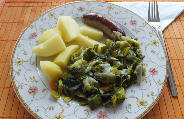 Porree-Gemüse mit Bratwurst und Kartoffeln