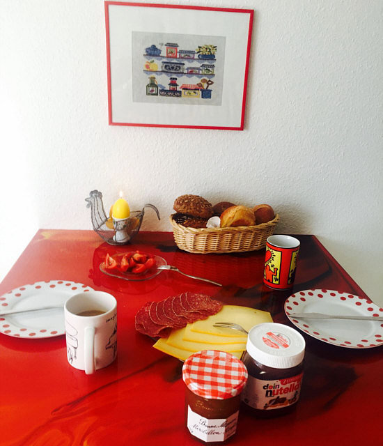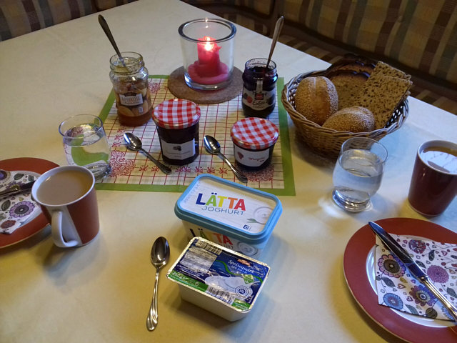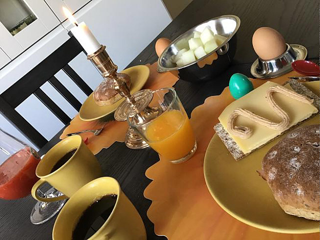 Hier zwei Bilder vom ganz normalen Frühstück am Küchentisch; einmal am