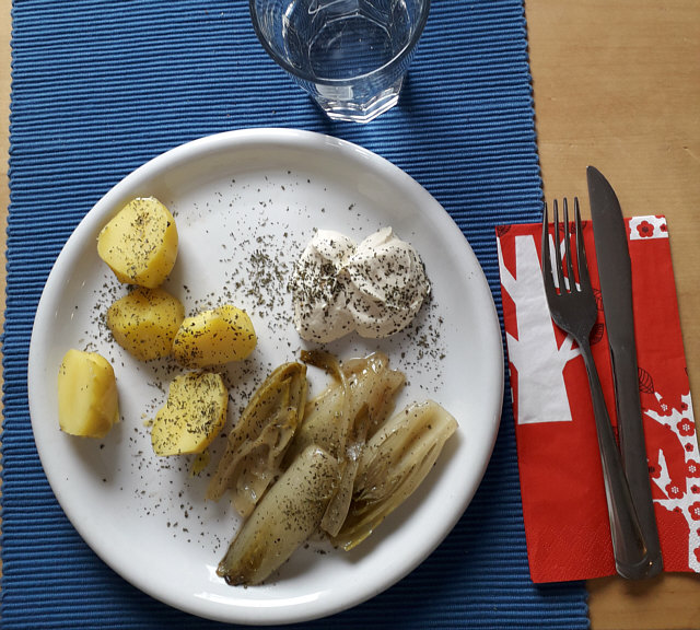 Chicoree geschmort mit Pellkartoffel und Schmand mit Senf verrührt