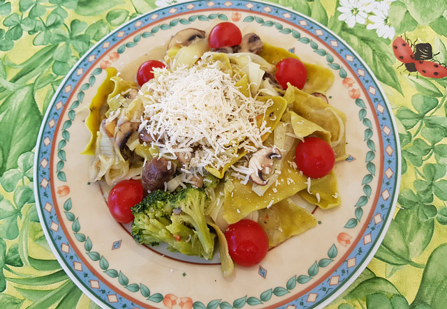 Vegetarisch gefüllte Teigtaschen (Fertigprodukt) als Pfannengericht mit