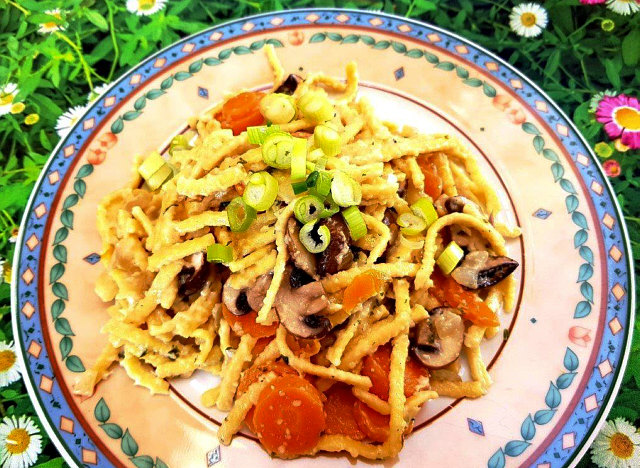Spätzlepfanne mit Möhren und Pilzen. Leider gab es die Pilze nicht