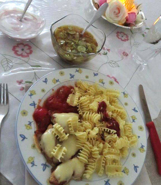 Hähchnenbrust mit Käse überbacken, dazu warme Tomaten und Nudeln, dann noch