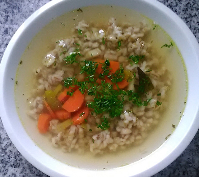 Selchsuppe mit frischem Suppengemüse, Rollgerstl (Graupen) und