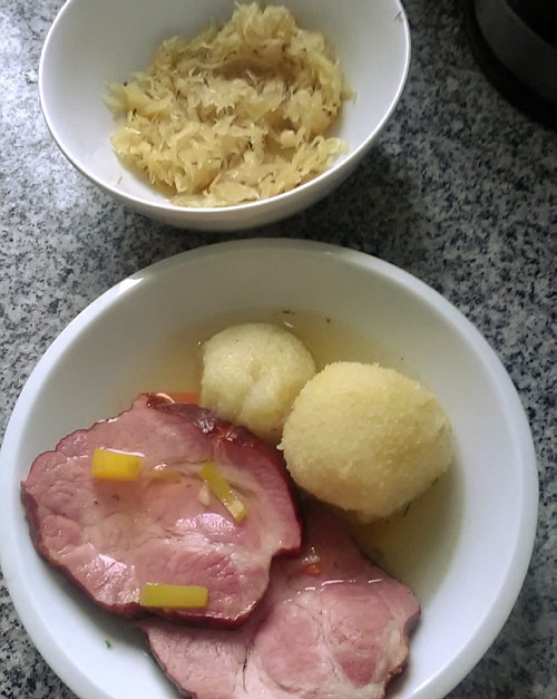 mit Bayrischen Erdäpfelknödel (halb und halb) und Gabelkraut.