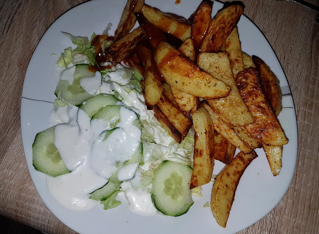 Selbstgemachte Kartoffelspalten aus dem Backofen mit Grillgewürzöl,
