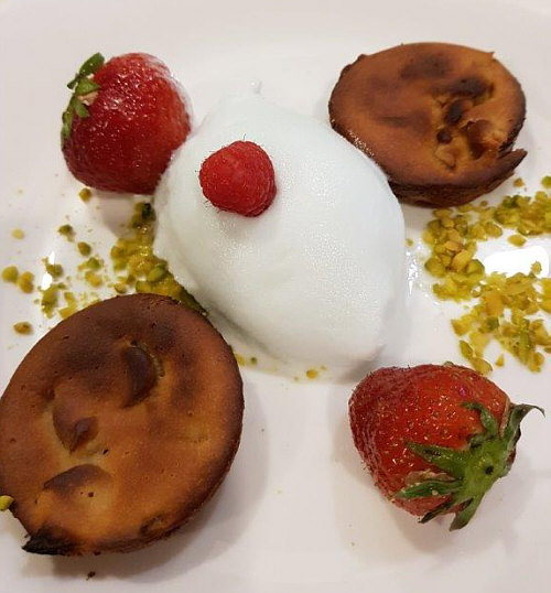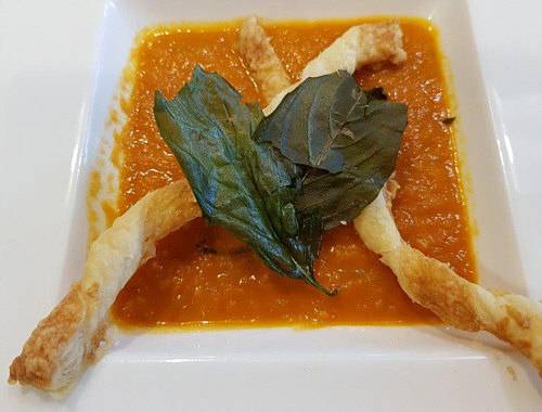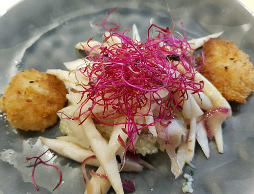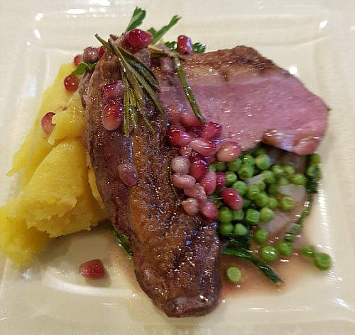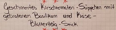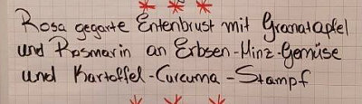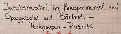 Heute gehen wir zu Moni in den Kochkurs. Moni schreibt: Hallo Morgen, lieber Engelbert, anbei findest du die Bilder von meinem Kochkurs, einschl. Speiseplan. Es nahmen außer mir 4 Ehepaare teil, wobei ich mich um den Nachtisch gekümmert habe. ![]() ![]() Am besten hat mir der Spargelsalat geschmeckt. ![]() ![]() Dafür werden der Spargel und rote Zwiebeln in feine Streifen geschnitten, das Ganze kurz angeschwitzt und dann mit einer Vinaigrette serviert. Die rote Deko besteht aus Rote-Bete-Sprossen. Gut gefallen hat mir auch die Idee, Basilikum, Bärlauch oder Brennesselblätter zu frittieren. ![]() ![]() Das sieht als Deko hübsch aus und schmeckt gut. Interessant war, was der Koch riet, wie man an die Granatapfelkörner kommt. Er hatte riesige Früchte, die halbiert und über einem Topf Wasser geklopft wurden, sodass die Körner ins Wasser fielen, man keine schmutzigen Finger bekam und die weißen Zwischenwände nicht störten. Nach dem kurzen Anbraten wurde die Entenbrust auf ein Blech gelegt, und zwar waren auf dem Blech die Granatapfelkerne und Rosmarin verteilt sowie Butterflocken. Auf letztere kam also die Entenbrust und das Ganze 20 Min. bei 95 Grad in den Ofen. Somit war das Fleisch auf den Punkt zart und rosig. Ich habe allerdings auf den Genuss verzichtet. ![]() ![]() |
