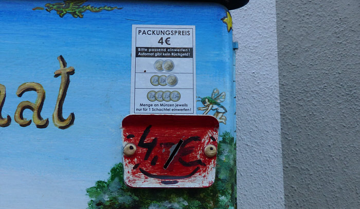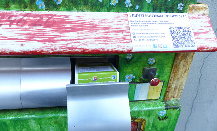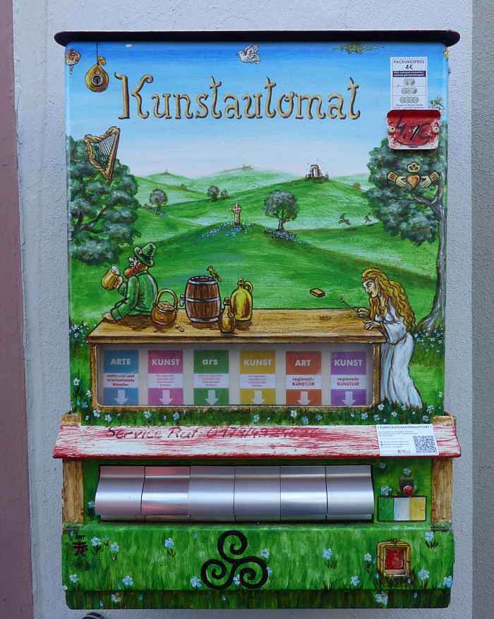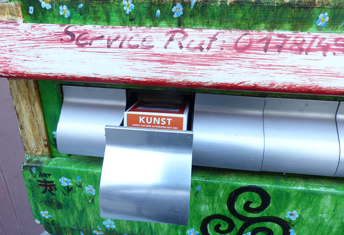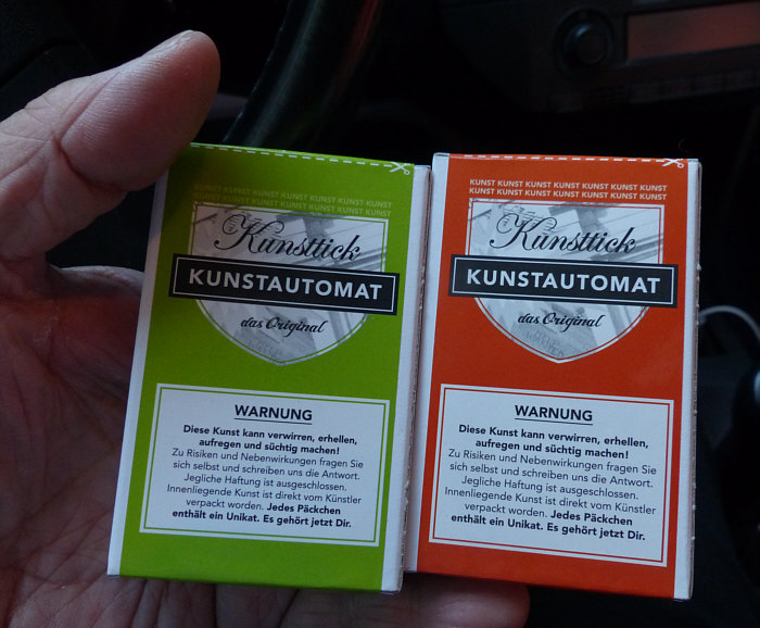 Letzten Sonntag kam ich an diesem Automaten vorbei: ![]() Ein ehemaliger Zigarettenautomat, der nun ein Kunstautomat ist: ![]() Man wirft 4 Euro hinein ... ![]() ... und kann sich dann ein Kunstwerk kaufen. Neugier ... die reine Neugier war es, die mich bewogen hat, das zu tun. Und die auch Beate überredete, sich auch Kunst zu kaufen. ![]() ![]() Und nun ? ![]() Nun habe ich zwei kleine Kästchen in der Hand ... werde ich damit glücklich ? Oder unglücklich ? Oder verzweifelt ? Werde ich es bereuen ? Wird es mich begeistern = Oder bereichern ? Und Du ? PS: hättest Du Dir auch Kunst gekauft ? Was meinst Du ... obs sich gelohnt hat ? Deine Gedanken zum Kunstautomaten ? |